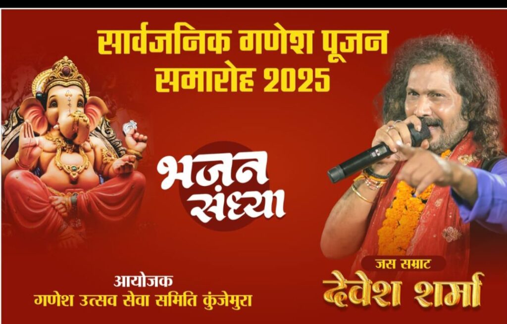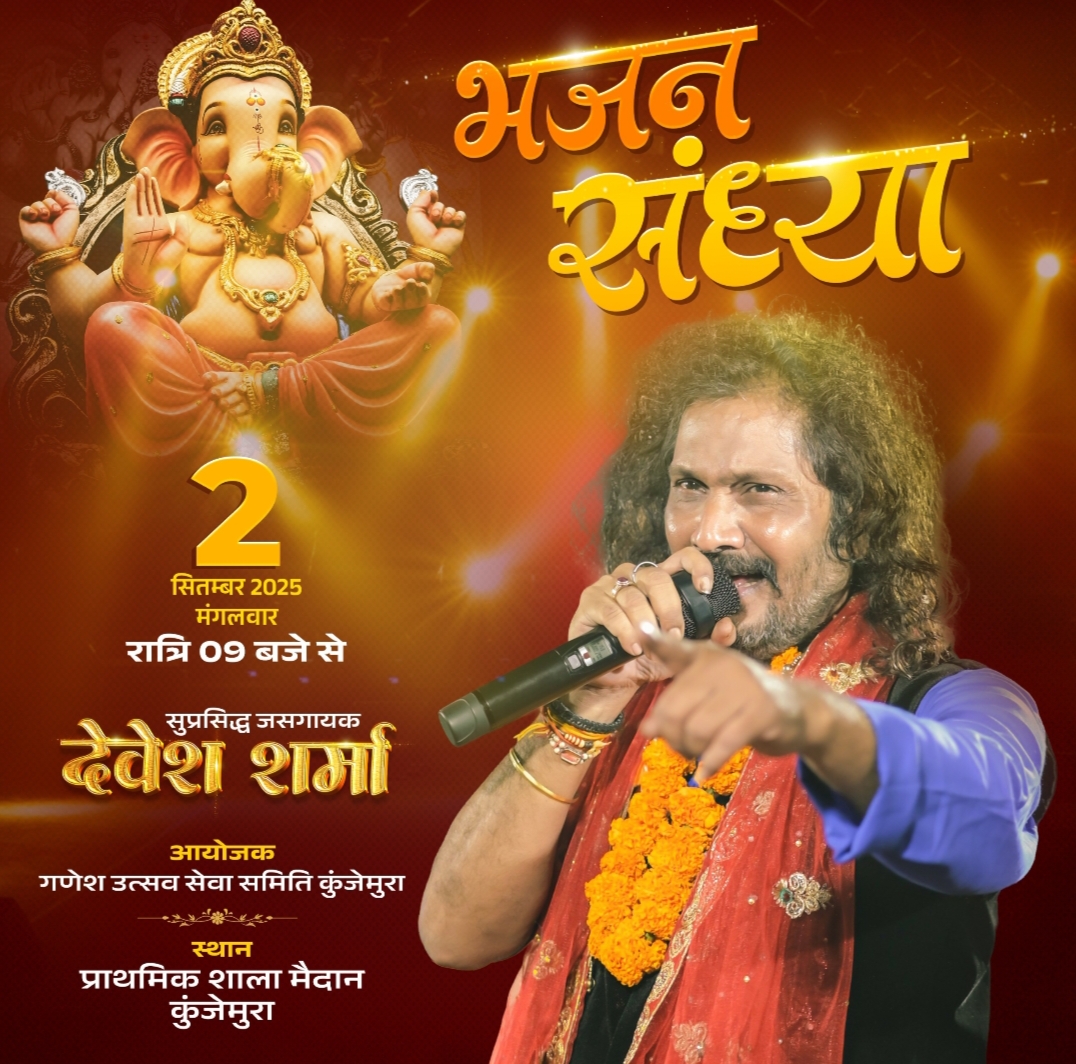 सार्वजनिक गणेश पूजन समारोह के अवसर में तमनार ब्लाक के कुंजेमुरा गांव में 2 सितंबर दिन मंगलवार को रात 9 बजे से भजन संध्या का आयोजन किया जा रहा है, जिसमें जस गीत सम्राट देवेश शर्मा शिरकत करेंगे देवेश शर्मा के प्रसिद्ध गाना मोर पथरा के देवता, नदिया में रोए दाई लईका, नाचे जो बब्बर शेर जैसे जस गीत, लाइव देखने का मौका मिलेगा देवेश कुंजेमुरा ग्राम वासियों ने अधिक से अधिक संख्या में जस गीत प्रेमियों को आमंत्रित किया है, जिससे जस गीत और भजन प्रेमी कार्यक्रम का आनंद उठा सकें, भजन संध्या का कार्यक्रम कुंंजेमुरा गांव के प्राथमिक शाला स्कूल, पंचायत भवन परिसर में होगा.