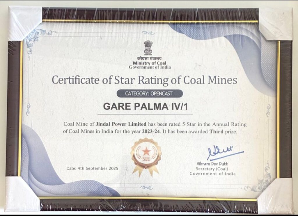 तमनार-छत्तीसगढ़ के लिए यह गर्व का क्षण है कि जिंदल पावर लिमिटेड की गारे पालमा 4/1 कोल माइन्स को एक बार फिर प्रतिष्ठित वार्षिक कोल एवं लिग्राइट माइन्स (23-24) की 5-स्टार रेटिंग से सम्मानित किया गया है। उल्लेखनीय है कि यह उपलब्धि इसे छत्तीसगढ़ की एकमात्र वाणिज्यिक कोल माइन्स बनाती है, जिसे लगातार दो वर्षों तक यह सम्मान प्राप्त हुआ है।