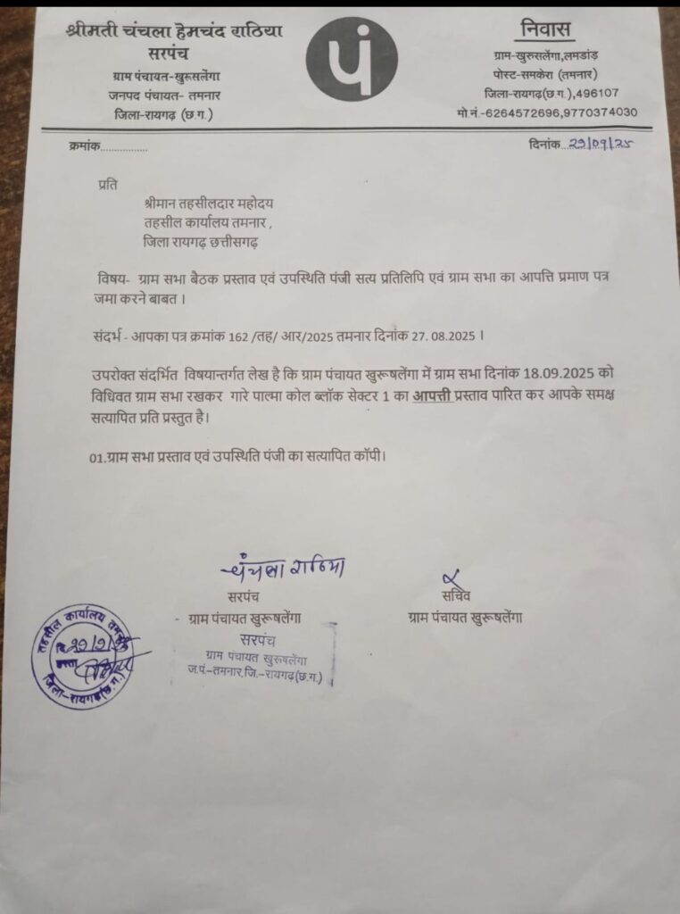 रायगढ़। तमनार ब्लॉक के ग्राम पंचायत खुरूसलेंगा के ग्रामीणों ने गारे पेलमा सेक्टर-1 ओपनकास्ट कम अंडरग्राउंड कोल माइन्स परियोजना के खिलाफ मोर्चा खोलते हुए निर्धारित लोकसुनवाई को रद्द करने की मांग की है।