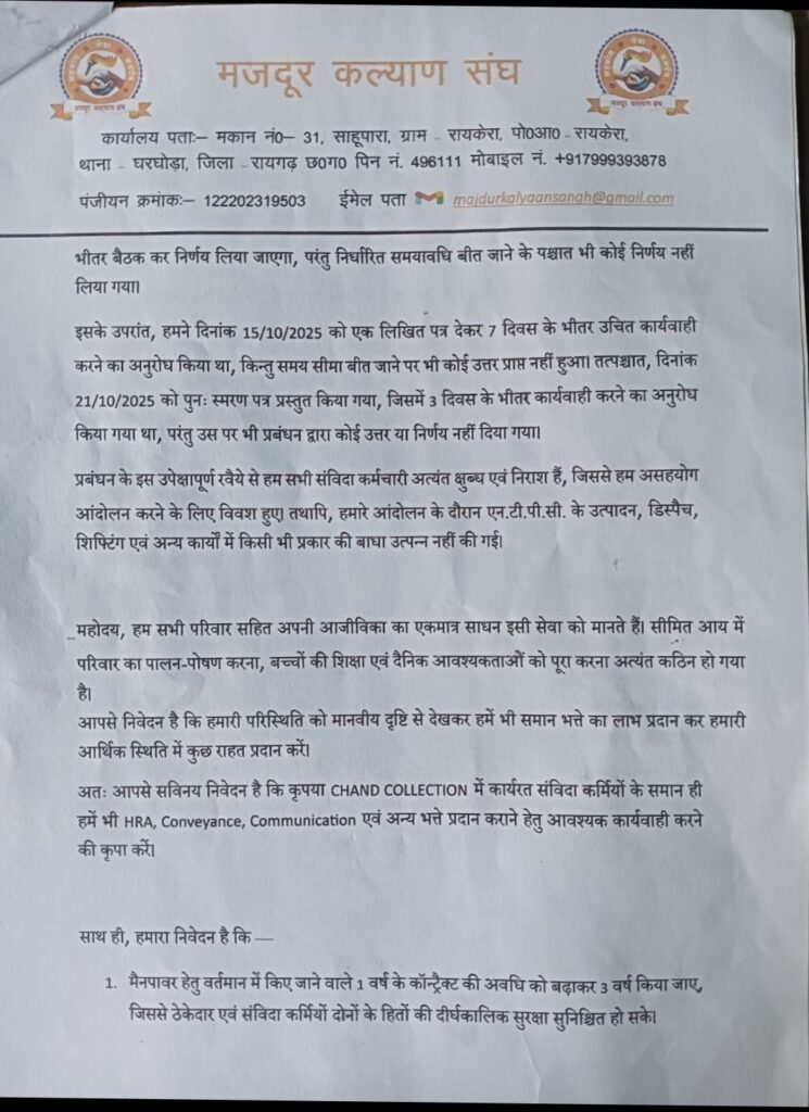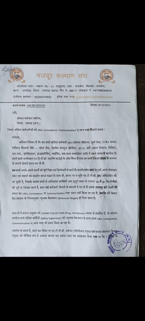 घरघोड़ा (रायगढ़)। एन.टी.पी.सी. तलाईपल्ली परियोजना में कार्यरत विभिन्न विभागों — जैसे कोल लैब, डिस्पैच कंप्यूटर ऑपरेटर, सर्वे (खनन विभाग), सिविल, एचआर, इलेक्ट्रिकल, हाउसकीपिंग, गार्डनिंग और सब-पावर सबस्टेशन — के संविदा कर्मियों ने आज मजदूर कल्याण संघ के बैनर तले कलेक्टर रायगढ़ को एक विस्तृत ज्ञापन सौंपा।